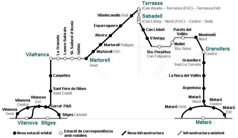 La futura línia es configura com un eix de 120 quilòmetres de longitud total, amb trams que aprofiten línies existents i 78 quilòmetres de nova construcció. Els nous trams de línia que caldrà construir seran els de Vilanova i la Geltrú a Vilafranca del Penedès, de Martorell a Terrassa, de Barberà a Santa Perpètua i de Montmeló a Mataró. El traçat es completa amb trams que formen part de la xarxa ferroviària d’Adif: de Vilafranca a Martorell, de Terrassa a Sabadell i de Santa Perpètua a Parets del Vallès.