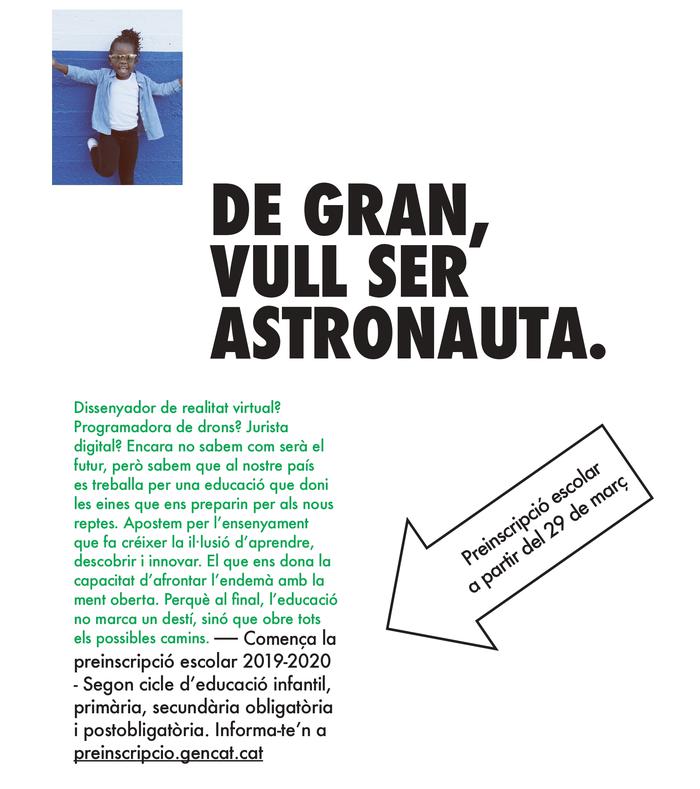 El Departament d'Educació ha rebut 148.693 sol·licituds de preinscripció per als estudis obligatoris de cara al proper curs escolar 2019-2020. Aquestes sol·licituds en concentren majoritàriament a P3 i 1r d’ESO, en el cas de P3 perquè és l’edat on comença l’escolarització obligatòria i a 1r d’ESO quan es produeix el canvi de l’escola a l’institut.