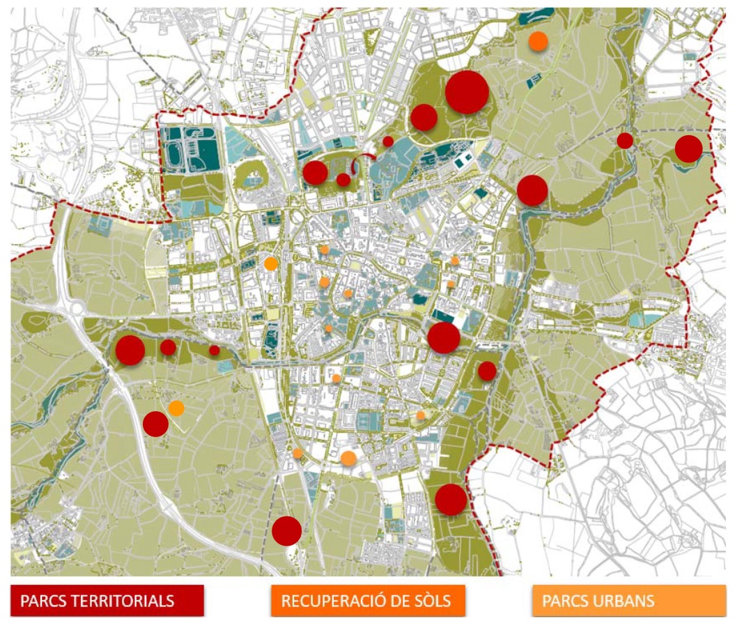 1. Espais lliures. Es proposa estructurar una xarxa amb diferents nivells. Els parcs territorials conformen l’Anella Verda al voltant del nucli urbà: són els parcs fluvials del Méder i del Gurri i els turons al nord de la ciutat. Els parcs urbans i les places faciliten l’esponjament de les àrees més denses i lliguen la trama urbana. El POUM preveu ampliar els existents i crear-ne de nous.