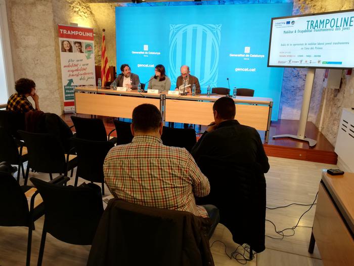 La directora general de Joventut, Laia Girós, i el director de l’Agència Catalana de la Joventut, Cesc Poch, han presentat avui a Girona els resultats de l’estudi sobre les oportunitats de mobilitat laboral dels joves en el territori fronterer pirinenc. Aquest estudi s’emmarca dins del projecte europeu Trampoline que fomenta la formació i la mobilitat dels joves en el territori dels Pirineus entre Catalunya, Aragó, Andorra i Occitània i que s’inclou dins del Programa Operatiu de Cooperació Territorial Espanya-França-Andorra (POCTEFA).