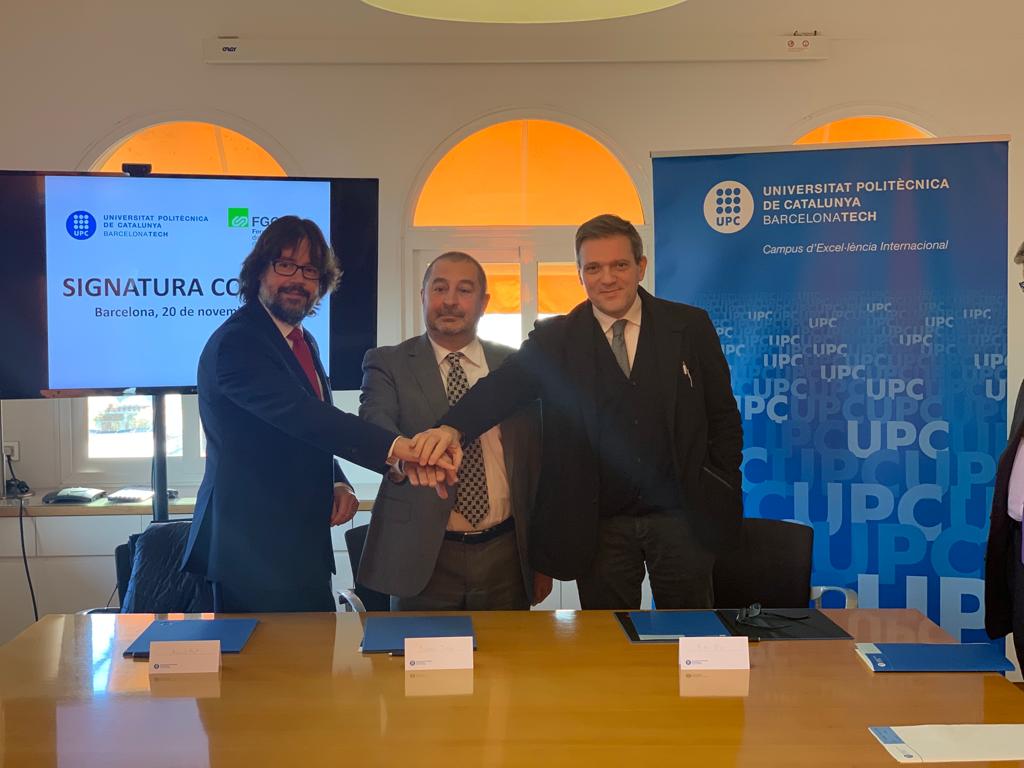 Ricard Font, president de Ferrocarrils de la Generalitat de Catalunya (FGC), Francesc Torres, rector de la Universitat Politècnica de Catalunya · BarcelonaTech (UPC), i Pedro Díez, director de l'Escola Tècnica Superior d'Enginyeria de Camins, Canals i Ports de Barcelona de la UPC, han signat avui, 20 de novembre, un conveni de col·laboració per tal d’impulsar processos de recerca, estudi, desenvolupament i formació en l’àmbit ferroviari.
