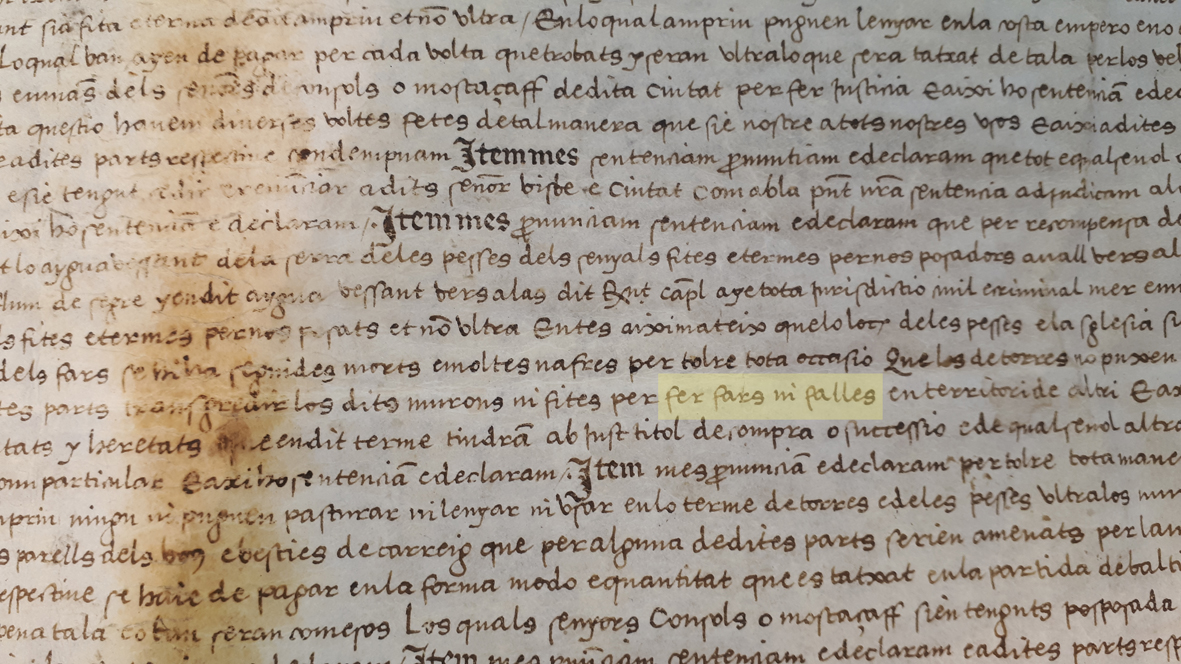 “Ítem més pronunciam, sentenciam e declaram per tolre tota manera de scàndol, vist que y a altra vegada per causa dels fars se hi ha seguides morts e moltes nafres, per tolre tota occasió, que los de Torres no puxen fer fars en dita serra, sinó en son territori, ço és, dellà los murons o fites per nos posades. E los de Alàs, per lo semblant, non puguen fer sinó en son territori, ço és, dessà los murons, fites e termes per nos posades, de modo que cada hu los fasse en son terme, e no sie lícit a ninguna de dites parts transgredir los dits murons ni fites per fer fars ni falles en territori de altri. E axí ho adjudicam e sentenciam, etc.”