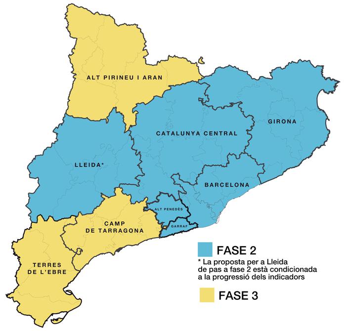 El Departament de Salut proposa que a partir de dilluns vinent, 8 de juny, la regió sanitària de la ciutat de Barcelona i les metropolitana sud i nord passin a fase 2 del desconfinament i les regions sanitàries del Camp de Tarragona; Terres de l’Ebre i la de l’Alt Pirineu i Aran avancin a la fase 3. Pel que fa a la regió sanitària de Lleida, també s’ha demanat que pugui avançar fins a la fase 2, tot i que aquesta proposta està condicionada a la progressió dels indicadors. Aquestes propostes han estat aprovades aquesta tarda pel PROCICAT i els informes s’enviaran avui mateix al Govern espanyol. La resta de regions sanitàries, la de Girona i Catalunya Central, i les àrees de gestió assistencial Penedès i el Garraf es mantindran en la fase 2, tal com ja estava previst.