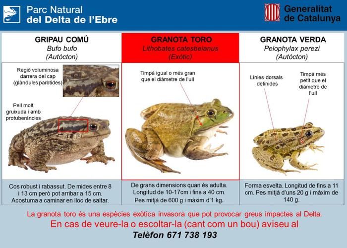 Personal tècnic del Parc Natural del Delta de l’Ebre ha confirmat la presència de granota toro (Lithobates catesbeianus), després de dos anys sense cap indici a la zona. Concretament, després d’un avís d’un pagès en veure un exemplar molt gran mort, les proves han corroborat que es tracta d’aquesta espècie. S’ha localitzat a 7 quilòmetres de la zona zero on el 2018 es va detectar per primera vegada, a un aiguamoll de l’hemidelta nord. També s’ha identificat en dos desguassos, segons els resultats de l’anàlisi ADN ambiental, una eina genètica que s’utilitza per detectar una espècie a través d’una mostra d’aigua, sense capturar l’exemplar.