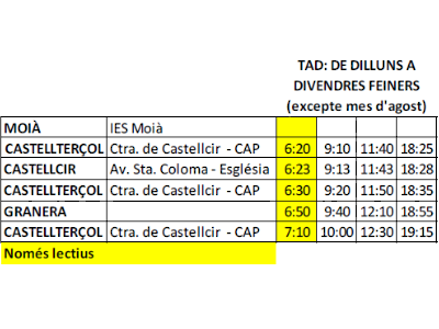 Finalment, cal afegir que es manté el servei de la línia regular Moià-Castellterçol–Castellcir en dies lectius tant al matí (7.30h) com per la tarda (15.00h).
