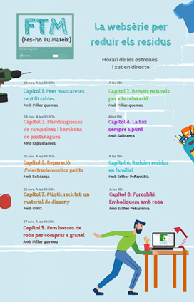 Amb motiu de la Setmana Europea de Prevenció de Residus 2020, cada dia d’aquesta setmana, fins al 27 de novembre, a les 10.30 hores i a les 18 hores, es publicarà un nou capítol de la websèrie “Fes-ho tu mateix”. Aquest és un recurs creat per l'Agència de Residus de Catalunya (ARC), del Departament de Territori i Sostenibilitat de la Generalitat de Catalunya, l'Àrea d'Acció Climàtica de la Diputació de Barcelona, i l'Àrea Metropolitana de Barcelona, coordinats per la Xarxa de Ciutats i Pobles cap a la Sostenibilitat.