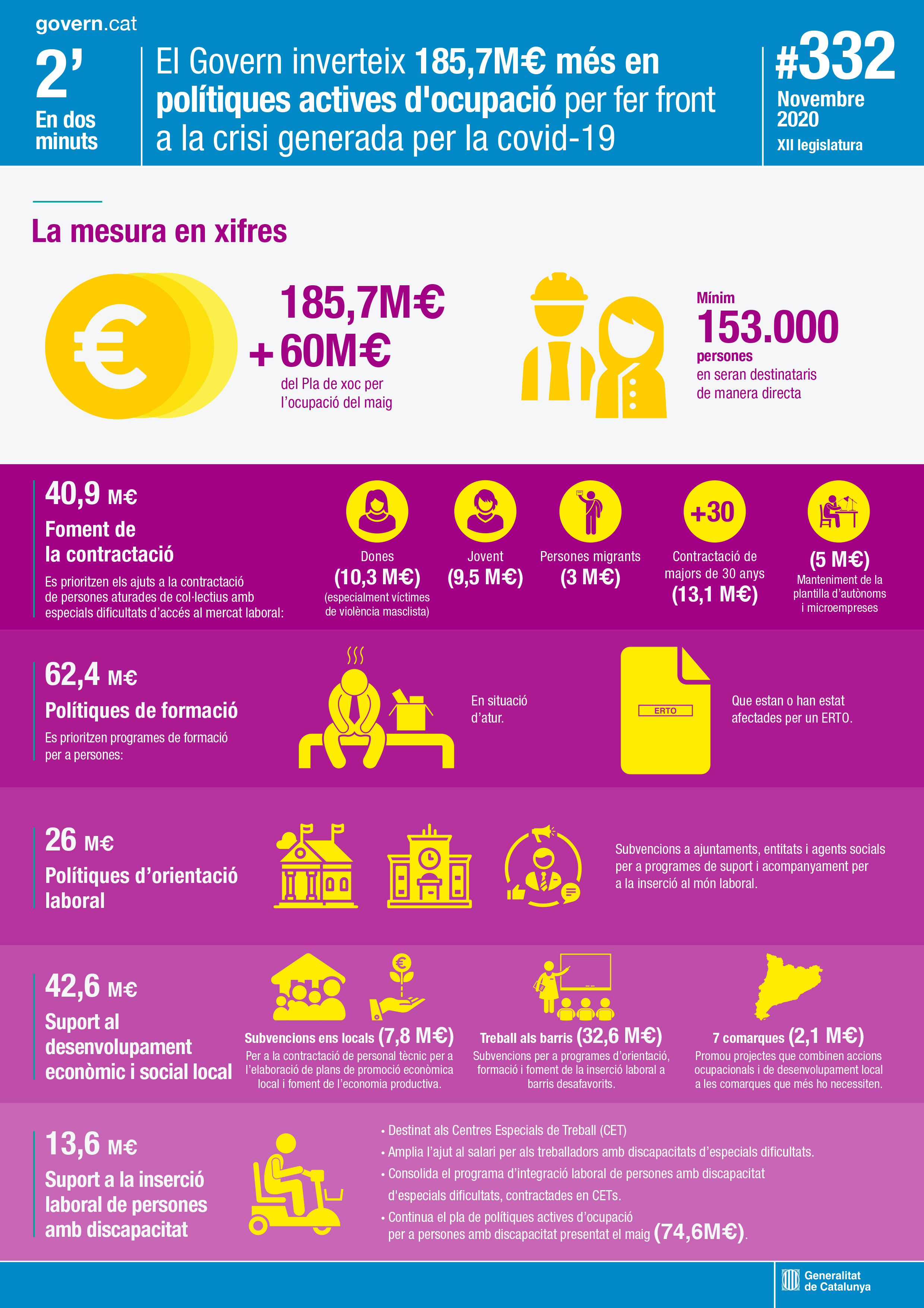 3 desembre 2020 16:04 event_note Nota de premsa Comunicació del Govern #332El Govern inverteix 185,7M€ més en polítiques actives d'ocupació per fer front a la crisi generada per la covid-191Fitxers adjuntsFitxers adjunts El Govern inverteix 185,7M€ més en polítiques actives d'ocupació 175Comparteix: