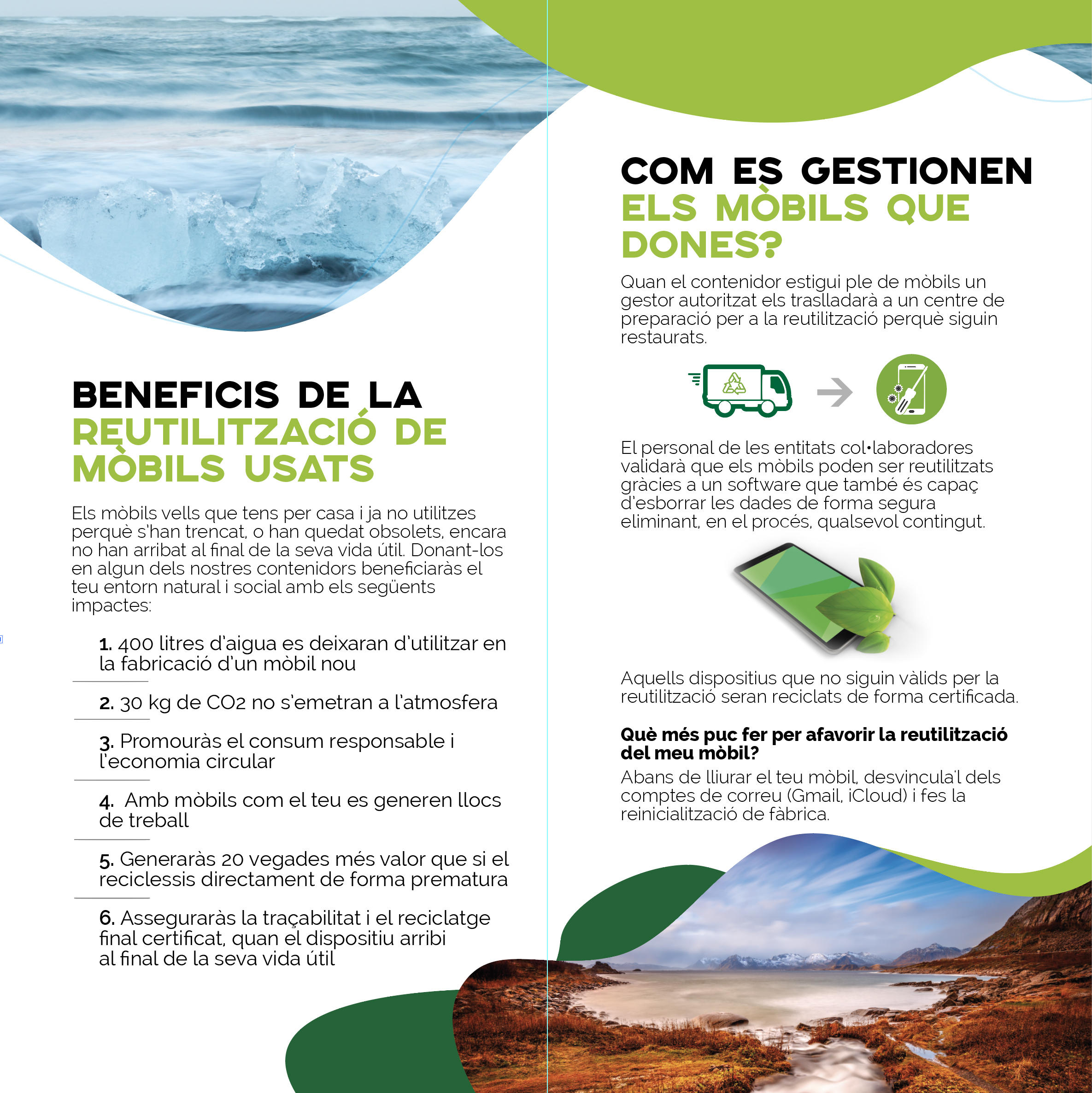 Els telèfons mòbils estan fets, en gran part, de materials que constitueixen recursos naturals no renovables. La reutilització i el reciclatge d’aquests materials estalvia l’extracció de noves matèries primeres i permet reduir el consum d’energia en la fabricació de nous aparells. A banda, una gestió no sostenible d’aquests residus té impactes ambientals molt perjudicials.