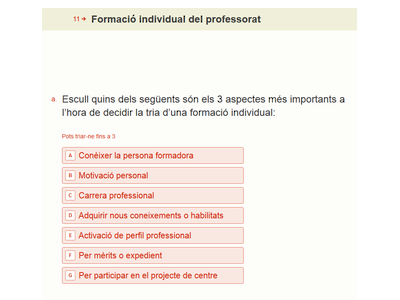 - Formació del professorat: per conèixer les raons de la formació individual, quins aspectes es valoren per triar una formació, o la qualitat de les formacions en claustre.