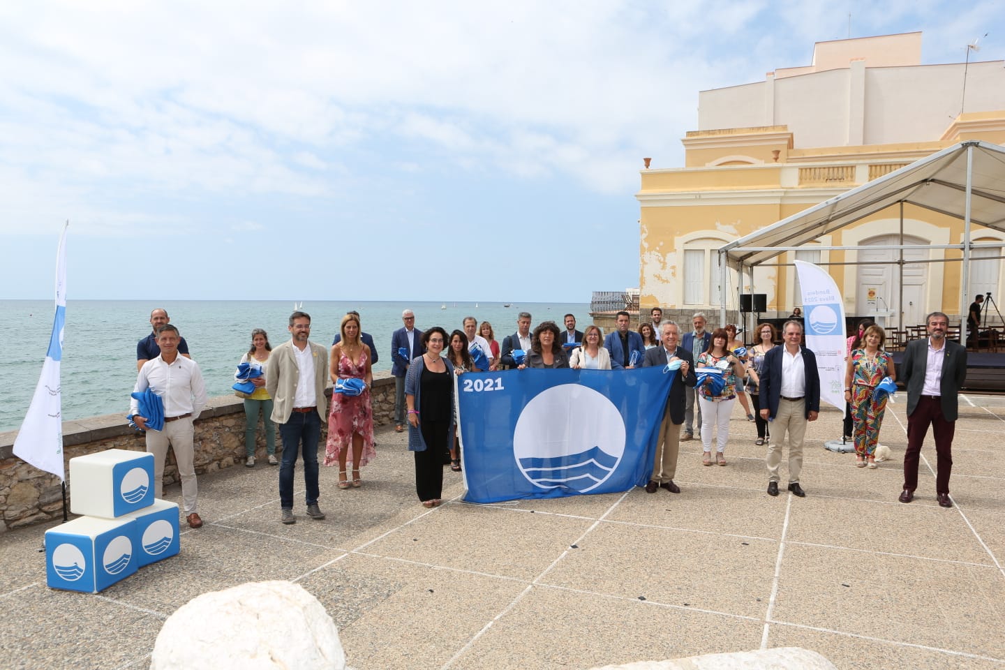 La consellera d’Acció Climàtica, Alimentació i Agenda Rural, Teresa Jordà, acompanyada pel director de l’ACA, Lluís Ridao, i l’alcaldessa de Sitges, Aurora Carbonell, entre d’altres autoritats, ha lliurat avui el guardó de les Banderes Blaves a un total de 97 platges catalanes, dues més que l’any passat. D’aquestes, 26 corresponen a la demarcació de Girona, 31 a la Barcelona, 29 a la de Tarragona i 11 a la de les Terres de l’Ebre.