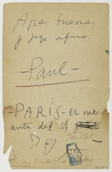 Al revers de la carta hi consta el comiat i la signatura Apa buenas / y suyo afmo / Paul, només el nom, en francès, subratllat amb dues línies, una feta amb tinta i l’altra amb llapis vermell. Sota la signatura hi consta la localització i la data PARIS – el mes / antes del 14 de julliet (sic). Aquesta última paraula està ratllada i escrita correctament Juillet amb una lletra que no correspon a Picasso, la mateixa que escriu l’adreça 130 ter Boulevard Clichy, de París. Aquesta adreça correspon al domicili del marxant Pere Mañach, on va viure Picasso l’any 1901 amb el seu amic Manuel Pallarés. Carles Casagemas també es va allotjar en aquest domicili durant uns dies aquell mateix any, poc abans de suïcidar-se. A la part inferior de la carta hi ha dos esbossos d’un rostre i el dibuix d’un cap que Josep Palau Fabre considera un retrat o interpretació de Rodin.