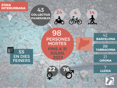 El Servei Català de Trànsit (SCT) informa que fins al 31 de juliol d’aquest 2022 98 persones han mort en 89 accidents mortals a la xarxa viària interurbana de Catalunya. Durant el mateix període de l’any passat, van perdre la vida 77 persones en 73 accidents mortals. Fins al juliol de 2019, abans de la pandèmia, van perdre la vida 101 persones en 95 sinistres mortals[1]. Pel que fa al nombre de víctimes mortals, es registra una reducció del 3% respecte al 2019.