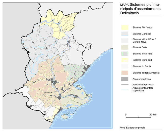 Per comarques, la Terra Alta se singularitza pel seu caràcter rural i l’escàs poblament, mentre que la Ribera d’Ebre s’ha caracteritzat per l’especialització energètica. Per la seva banda, el Baix Ebre i el Montsià s’han beneficiat del fet que les travessi el corredor d’infraestructures del Mediterrani i concentren els nuclis de població més grans.