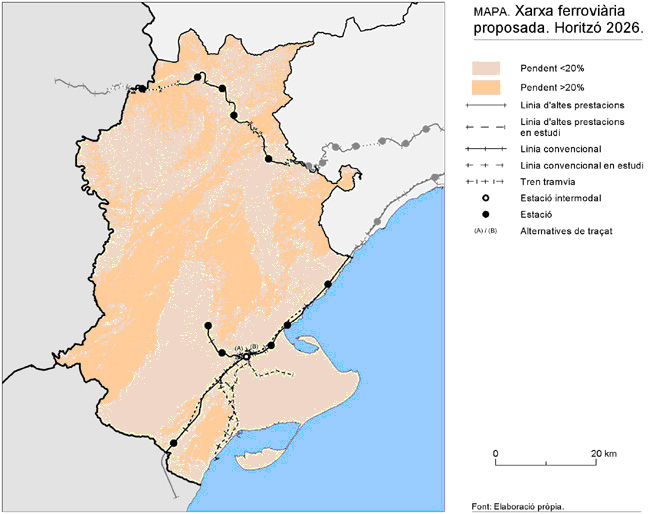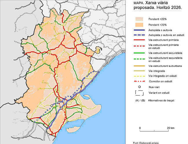 - Inclou la potenciació dels principals eixos viaris amb la substitució funcional de l’N-340 per l’autovia A-7 com a via ràpida de gran capacitat, la reconversió a autovia de la C-12, la construcció de variants i el condicionament de la xarxa de carreteres secundàries.
