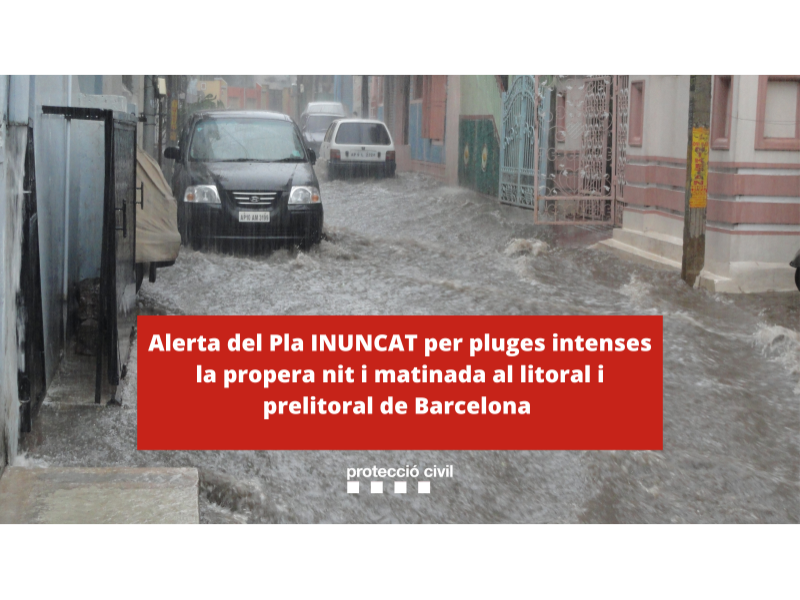 Protecció Civil de la Generalitat ha activat aquest matí l’alerta del Pla INUNCAT per la previsió del Servei Meteorològic de Catalunya (SMC) d’un episodi de pluges intenses aquesta propera nit i matinada que podria deixar quantitats destacades sobretot a les comarques del litoral i prelitoral de Barcelona.