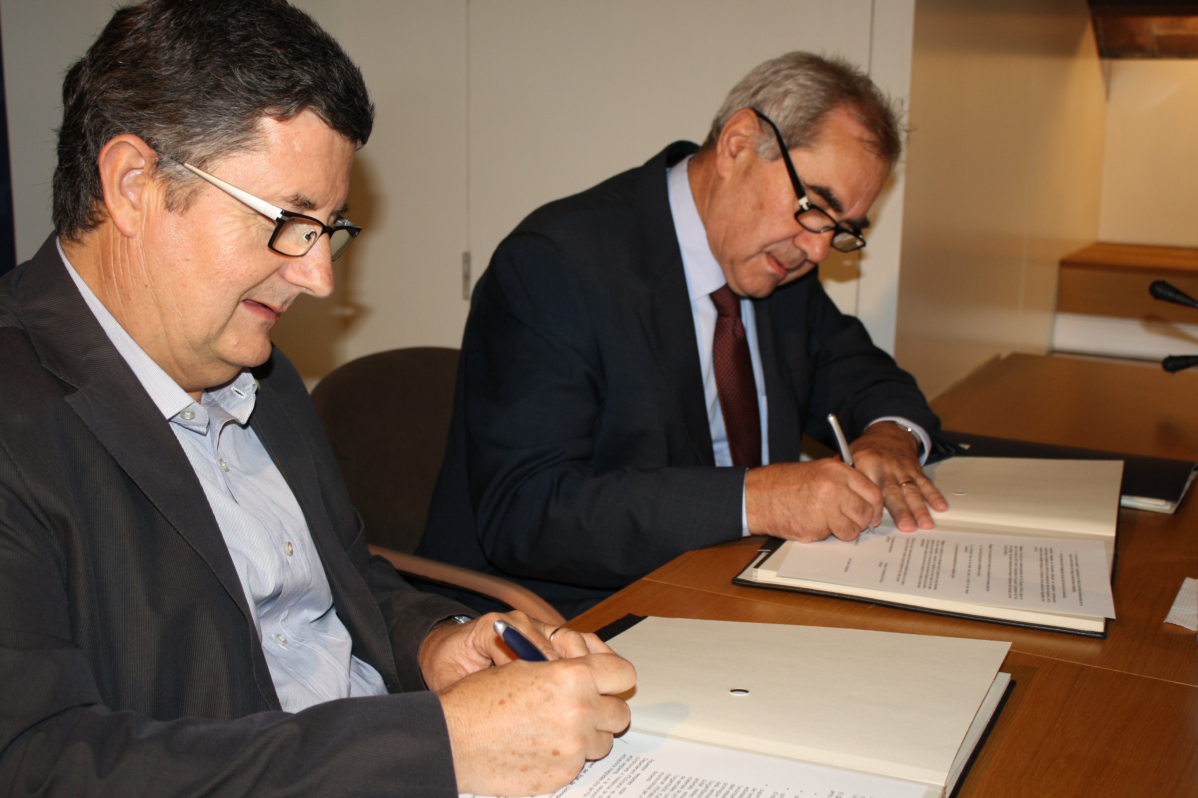 El conseller d’Educació, Ernest Maragall ha signat juntament amb l’alcalde del Prat de Llobregat, Lluís Tejedor, el conveni de col·laboració entre el Departament d’Educació i l’Ajuntament del Prat de Llobregat per al Pla educatiu del barri de Sant Cosme fins l’any 2014.