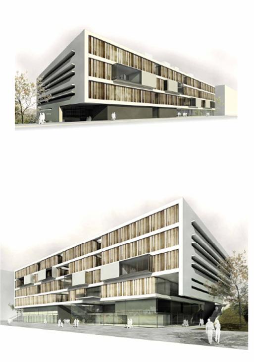 Docència: distribuïda en la planta semisoterrani, altell i baixa, amb accés directe des del carrer i des de la rambla interior. És la cantonada més propera a l’hospital per tal de facilitar-ne la comunicació. S’hi ubicarà la cafeteria en el lloc de vianants més públic, la sala d’actes més a l’interior però amb accés directe i les aules a la planta baixa per tal de disposar de zones àmplies. L’altell, aprofitant l’alçada albergarà les sales d’ordinadors i treball per tal d’estar en zones més tranquil·les.
