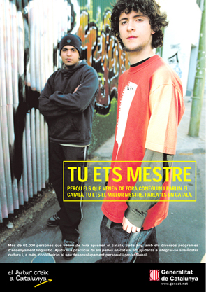 Els espots de televisió i ràdio presenten tres situacions de la vida quotidiana: un mercat, la cuina d’un restaurant i una conversa entre dos joves. En tots tres casos un català s’adreça en aquesta llengua a una persona immigrada que tanca l’anunci dient “Ajuda’m, parla’m en català”. Els anuncis que es distribuiran en premsa escrita reprodueixen una fotografia de cadascuna d’aquestes situacions, amb el lema “Tu ets mestre”. La campanya ha estat encarregada, per concurs públic, a l’empresa Scacs.