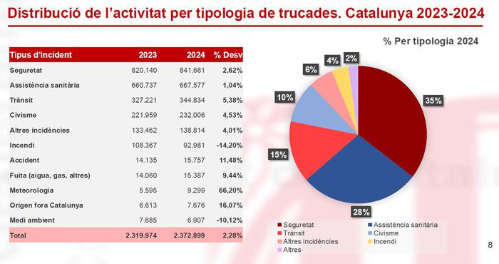 El Centre d’Atenció i Gestió de Trucades d’Urgència 112 Catalunya CAT112, que depèn del Departament d’Interior i Seguretat Pública, va rebre l’any passat un total de 2.372.899 trucades operatives (originades per avisar d’una emergència i van activar algun tipus de recurs, com policia, bombers, emergències mèdiques, agents rurals o protecció civil). Aquest volum va representar el 2,3% més de trucades que l’any 2023, quan van ser un total de 2.319.974 trucades.