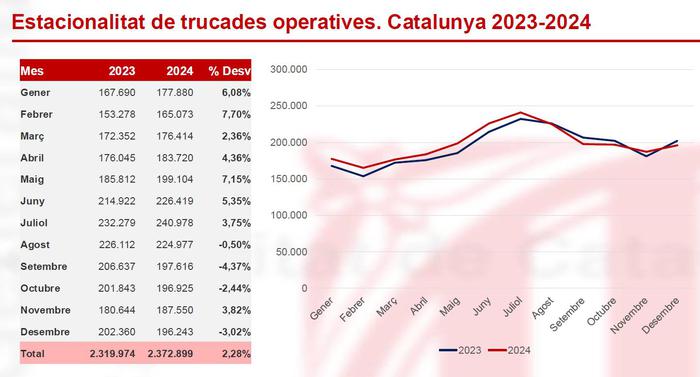 De totes les trucades operatives gestionades l’any 2024, el mes que es van atendre més trucades va ser el juliol (240.978 trucades), seguit del juny (226.419) i l’agost (224.977). Per contra, el mes amb menys trucades va ser el febrer (165.073) i el març (176.414).