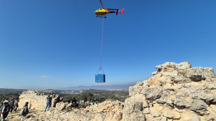 La previsió és poder utilitzar l’helicòpter o els animals com a mitjans auxiliars de l'obra en quatre jornades diferents, pujant el material i maquinària necessària des de la base accessible de l’aparcament fins a l’àmbit de l’obra. La primera jornada, on s’han fet 31 vols, ha servit per fer arribar els materials necessaris per a l’inici de l’obra i de l’excavació arqueològica. Per fer possible el vol de l’helicòpter, però, s’ha hagut de desmuntar la maquinària en parts transportables, i es tornarà a muntar in situ. Es faran dos viatges més per fer arribar els materials necessaris per a la consolidació i restauració de les restes i, després, per a l’adequació per a les visites. Finalment, la darrera jornada servirà per a retirar els materials de l’obra. En aquesta ocasió, la maquinària utilitzada s’haurà de tornar a desmuntar pel trasllat.