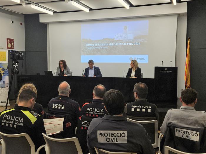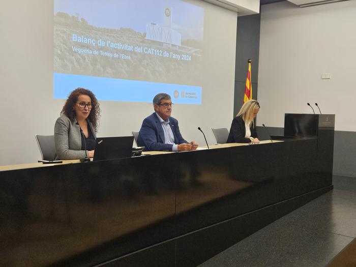 El delegat del Govern a les Terres de l’Ebre, Joan Castor Gonell, la directora del CAT112, Irene Fornós, i la directora dels serveis territorials d’Interior a Terres de l’Ebre, Paula Navarro, han presentat avui a Tortosa el balanç d’activitat del telèfon d’emergències 112 a la vegueria de les Terres de l’Ebre durant l’any 2024. A la presentació hi han assistit també comandaments del CAT112, Mossos d’Esquadra, Protecció Civil de la Generalitat, Bombers de la Generalitat, Cos d’Agents Rurals, SEM i Policia Local.