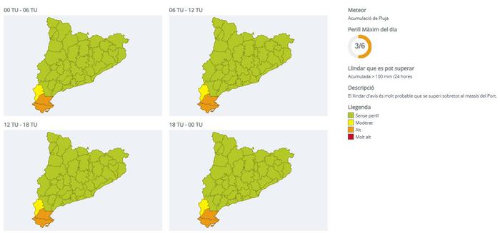Segons les previsions del Servei Meteorològic de Catalunya (SMC), es pot superar el llindar d'acumulació de pluja de 100 litres en 24 hores a les comarques del Baix Ebre i el Montsià, i amb menys probabilitat a la Terra Alta. El llindar d'avís és probable que se superi sobretot al massís dels Ports.