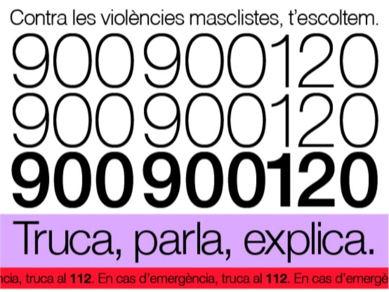 Recordem que davant qualsevol indici o situació de violència masclista cal trucar al telèfon 900 900 120. Hi pot trucar tothom. Tinguem ben present que una trucada pot salvar una vida. Aquesta línia és gratuïta, confidencial, no deixa rastre i opera les 24 hores cada dia de l'any en múltiples idiomes. Ofereix atenció psicològica directa, fa un primer assessorament jurídic i fa derivació, si així se sol·licita, als serveis especialitzats que acompanyen les dones en la seva recuperació.