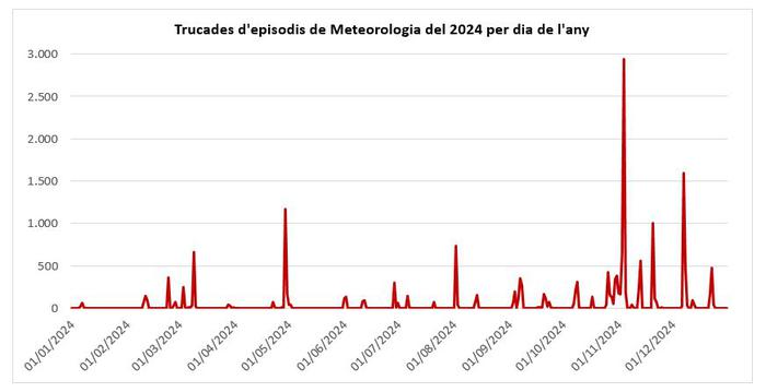 El mes de novembre va registrar el nombre més alt de trucades relacionades amb fenòmens meteorològics, amb un total de 6.143 trucades, coincidint amb l’episodi de la DANA, que va provocar condicions extremes en diverses zones de Catalunya. En particular, el 4 de novembre va ser el dia amb més trucades de l’any (2.934). Després d’aquest pic, el nombre de trucades va disminuir al desembre, amb 2.922, i a l’octubre, amb 2.218.