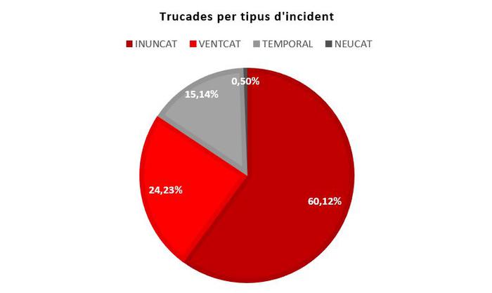 El 60,12% de les trucades van estar relacionades amb episodis INUNCAT (10.896), derivats del risc d’inundacions; el 24,23% (4.392) es van produir a causa d’episodis de VENTCAT, associats a forts vents, i el 15,14% (2.744) van correspondre a episodis de temporal, relacionats amb condicions meteorològiques adverses caracteritzades per una successió simultània de diversos tipus de fenòmens meteorològics.