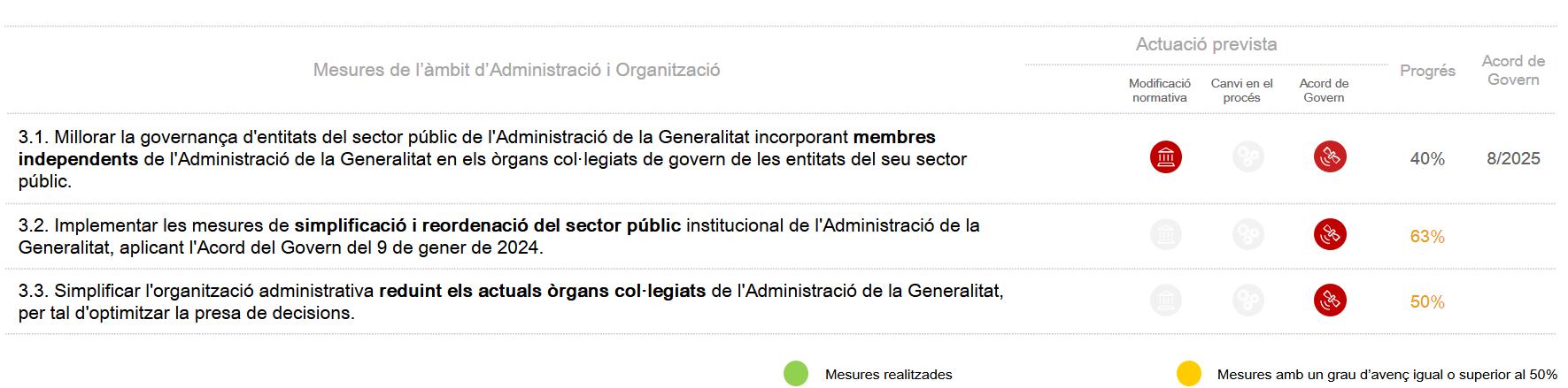 Pel que fa a la resta de mesures, n’hi ha nou de completades en més del 50%. Entre elles, destaquen la creació de 2.000 places de pràctiques remunerades per a joves estudiants per atraure talent del món universitari, la implementació de mesures per simplificar i agilitzar els processos de selecció i provisió de llocs de treball i la creació d'un sistema de valoració de la satisfacció en els tràmits digitals.