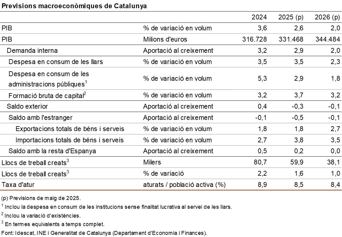 També, l’economia catalana segueix avançant per sobre de les economies del seu entorn. En línia amb els darrers anys, el PIB de Catalunya continua mantenint un diferencial positiu respecte al de la zona euro (creixements previstos del 0,8% el 2025 i l’1,2% el 2026 segons l’FMI) i se situa en línia amb l’economia espanyola, amb unes previsions del 2,5% i l’1,8% per aquests dos exercicis segons l’FMI, i del 2,6% i del 2,2% segons el Ministeri.