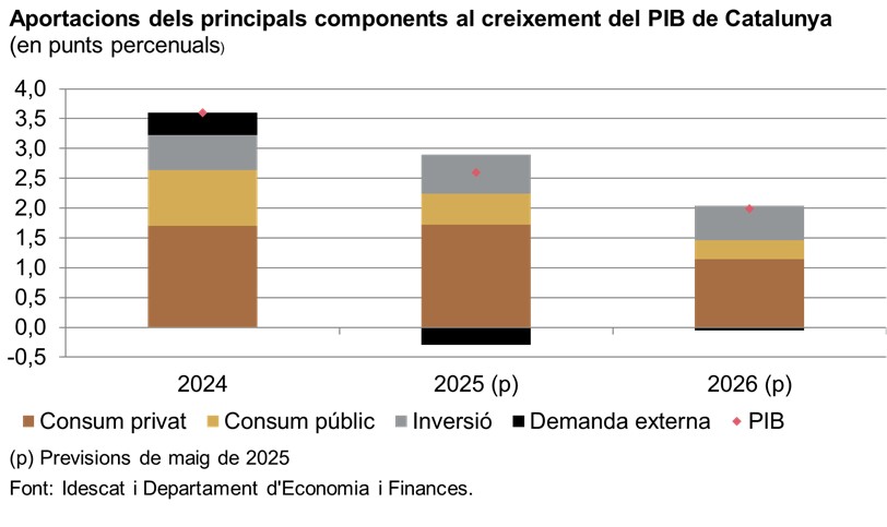 L’augment del PIB del 2025 (2,6% internanual) estarà impulsat per aportació positiva de la demanda interna (2,9 punts). El consum de les llars mantindria el ritme de creixement (3,5%), gràcies al to positiu del mercat de treball, el creixement sostingut dels salaris i la moderació dels preus. El creixement del consum de les administracions públiques es moderaria (2,9%), en un context de pròrroga pressupostària i després d’uns anys on aquest component ha tingut un pes destacat en l’evolució del PIB. Per a la formació bruta de capital es projecta un creixement significatiu, del 3,7%, gràcies a la millora de les condicions de finançament, el baix nivell d’endeutament empresarial i el suport dels fons NGEU. No obstant això, es tracta del component que pot veure’s més afectat per la incertesa dels agents econòmics.