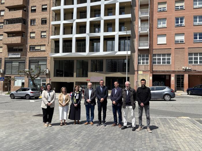 La delegació catalana ha visitat també l’edifici d’apartaments per a persones grans i amb discapacitat, ubicat al barri d’Azpilagaña (Pamplona), promogut per NASUVINSA (Navarra de Suelo y Vivienda, S.A.). Aquest edifici de fusta, construït amb criteris d’eficiència energètica i sostenibilitat, compta amb 39 habitatges i ofereix serveis comunitaris pensats per a fomentar l’autonomia i la convivència.