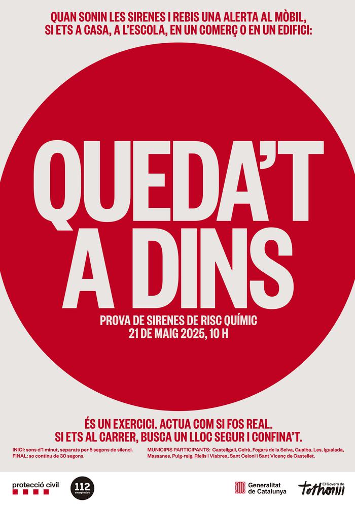 Demà dimecres, dia 21 de maig a les 10 hores, tindrà lloc la primera prova de les sirenes de risc químic d’aquest 2025. Es tracta de l’activació de les sirenes del sector químic de la Tordera, l’Aran, Anoia, Bages, Berguedà, la Selva i Girona, que sumen un total de 16 sirenes. A banda del so de les sirenes, els ciutadans d’aquestes zones també rebran prèviament una alerta de protecció civil als seus telèfons mòbils informant de la prova.