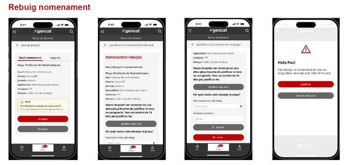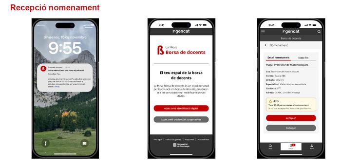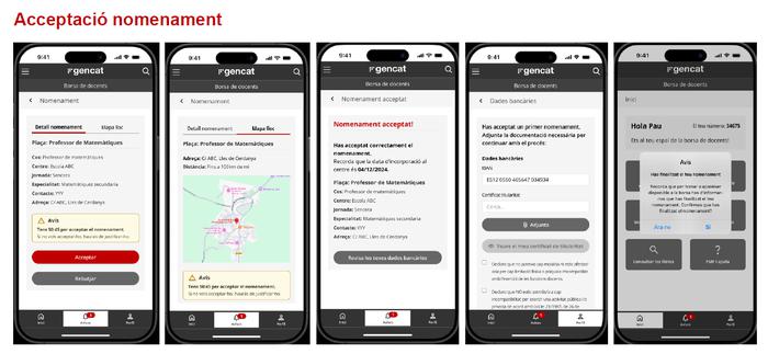 Aquesta primera fase incorporarà funcionalitats com l’acceptació o el rebuig del nomenament, la visualització de la ubicació del centre educatiu assignat mitjançant geolocalització, la descàrrega del document acreditatiu corresponent i la consulta actualitzada de les dades personals registrades al sistema. Posteriorment s’hi afegiran més funcionalitats.