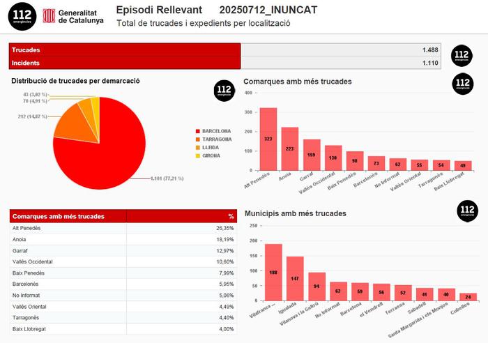El telèfon d’emergències 112 ha informat de 1.488 trucades relacionades amb les pluges fins les 19 hores, de les quals han destacat les 323 a l’Alt Penedès; 223 a l’Anoia; i 159 al Garraf.