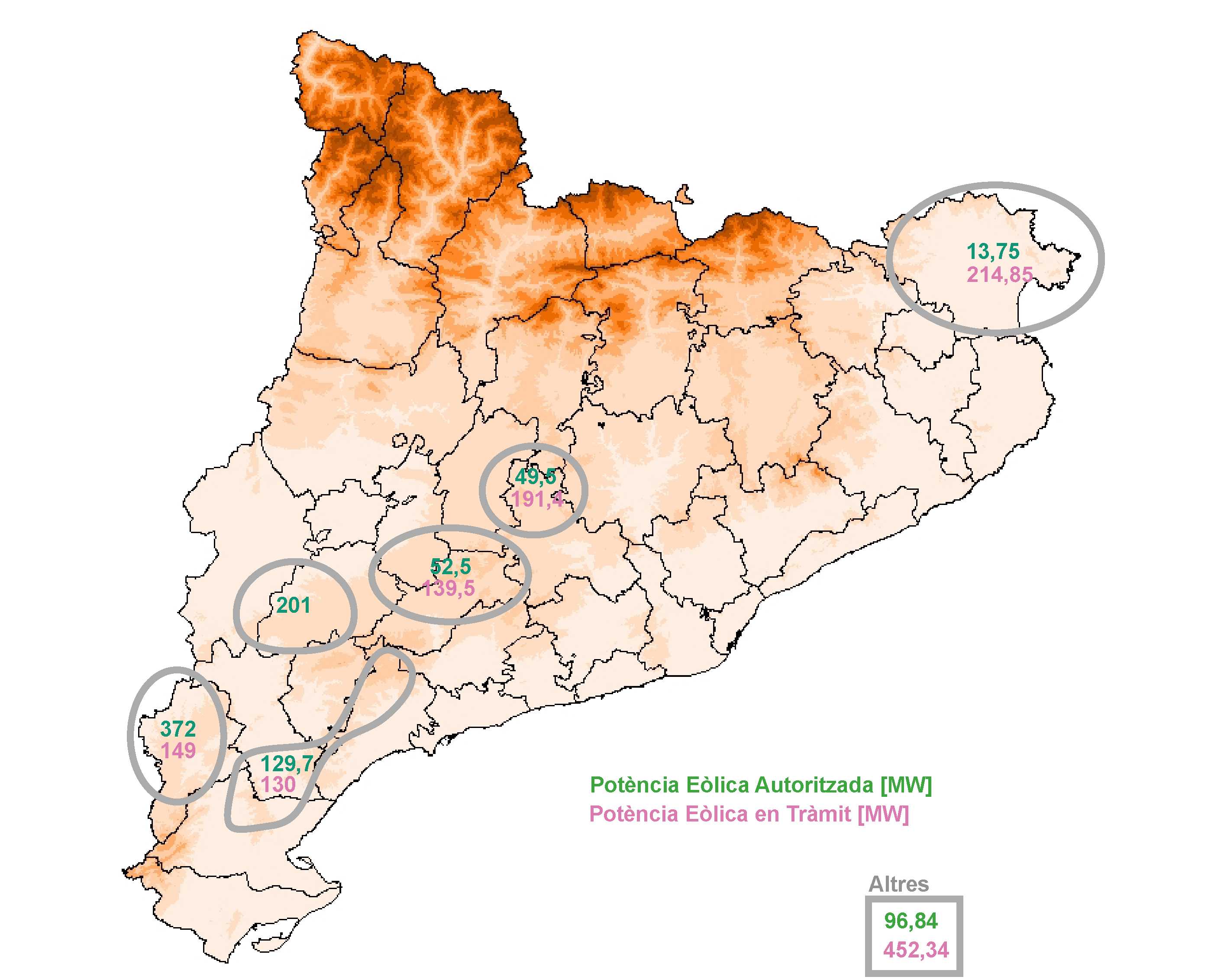 El nombre de projectes de parcs eòlics amb autorització administrativa a Catalunya és de 29. La potència que generaran serà de 915 MW. En aquests moments se n’estan construint dos - un a la Serra de Rubió (Anoia) amb una potència de 49,5 MW, i l’altre a Tortosa (Baix Ebre) amb una potència de 48,1 MW – i hi ha un tercer que properament també entrarà en construcció a Tortosa amb una potència de 29,9 MW. D’altra banda, hi ha 52 projectes de parcs eòlics pels que s’ha sol.licitat autorització administrativa per una potència superior als 1.200 MW.
