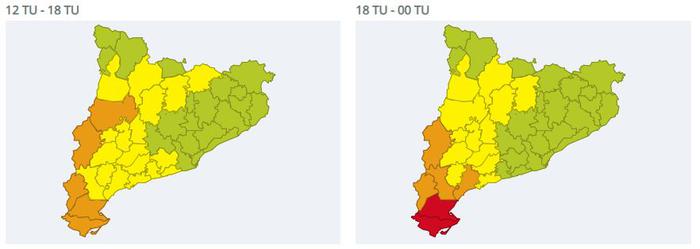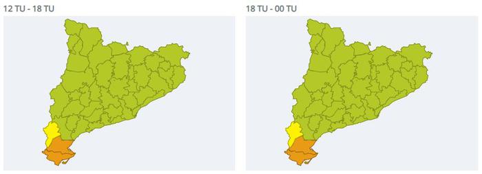 Els avisos per intensitat de pluja (més de 40 l/m2 en 30 minuts) afecten sobretot l’extrem sud de Catalunya i amb més probabilitat les comarques del Montsià, Baix Ebre i Terra Alta. En aquestes comarques també es preveuen les acumulacions més importants i que poden superar els 200 litres/m2 en 24 hores.