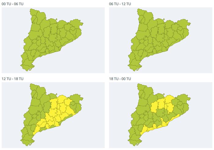 De matinada les precipitacions podran seguir afectant la zona del litoral des de les Terres de l’Ebre fins al Baix Llobregat. Ja de cara al migdia es poden reactivar de nou a qualsevol punt del litoral, prelitoral, Catalunya Central i comarques de Girona. Els xàfecs aniran sovint acompanyats de tempesta i localment de calamarsa.