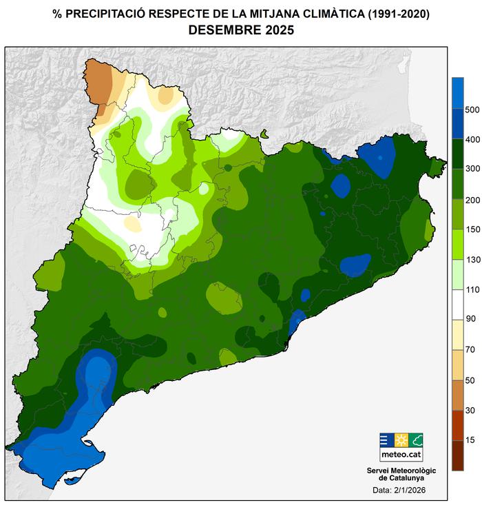 Barcelona, 02 de gener de 2026. Segons les anàlisis del Servei Meteorològic de Catalunya (Meteocat), el desembre de 2025 ha estat càlid arreu de Catalunya, amb anomalies de temperatura que han superat els +2 °C respecte de la mitjana 1991-2020 a moltes zones, i molt plujós al conjunt del territori, especialment al sud i al nord-est. Cal retrocedir fins al 1996 per trobar un desembre tant o més plujós al conjunt de Catalunya. Aquest comportament ha estat clau per tancar un 2025 que se situa com el quart any més càlid mesurat a Catalunya i un any plujós en general, marcat per una primavera extraordinàriament plujosa, un juliol molt plujós i un desembre que ha estat el més plujós del segle XXI.