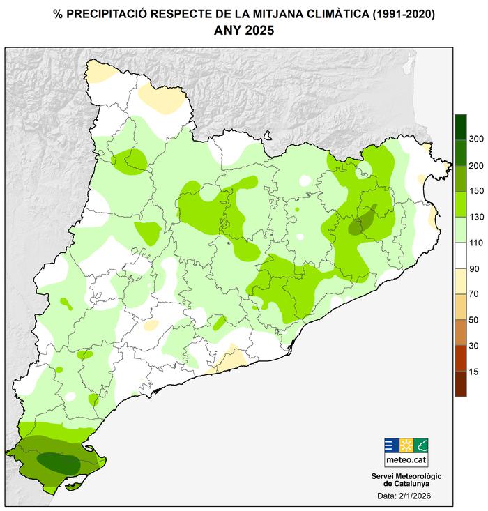 El 2025 ha estat un any plujós a Catalunya, amb un comportament especialment destacat al sud, on les precipitacions han estat molt abundants. Tot i que els anys 2018 i 2020 van registrar acumulacions globals més altes, el 2025 ha estat l’any més plujós en algunes sèries de l’extrem sud i en punts de l’Empordà.