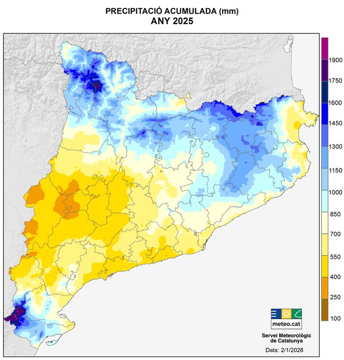En canvi, la precipitació ha estat relativament baixa al Segrià, el Pla d’Urgell, la Noguera, les Garrigues i la Ribera d’Ebre, amb valors inferiors als 400 mm.
