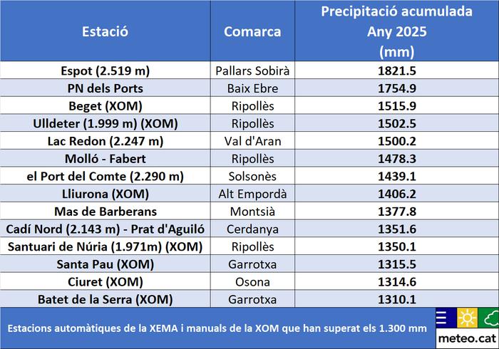 La precipitació anual ha estat impulsada per episodis excepcionals al llarg de l’any: una primavera molt plujosa, amb un març extremadament plujós; un juliol destacat, un dels més plujosos del segle XXI; i un desembre extraordinari, que ha superat totes les xifres del segle XXI.