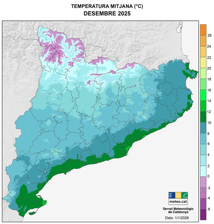 - Segons l’anàlisi del Servei Meteorològic de Catalunya (Meteocat) el desembre de 2025 presenta anomalies de temperatura superiors als +2 °C respecte de la mitjana 1991-2020 a moltes zones i precipitació excepcional al sud i al nord-est