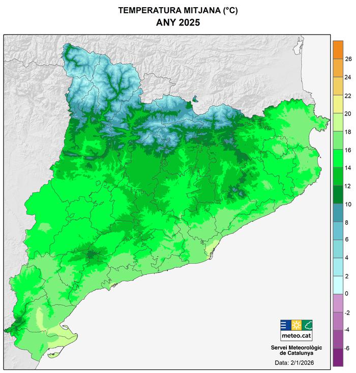 Globalment, el 2025 queda com el quart any més càlid a Catalunya, amb una anomalia d’uns+1,2 °C respecte del període 1991-2020. Tot i no ser un any de rècord, destaca el fet que no s'havien registrat mai quatre anys consecutius tan càlids, un fet inèdit en l’època instrumental.