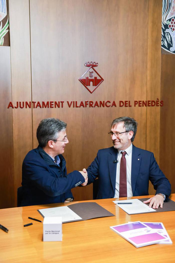 L’Ajuntament de Vilafranca del Penedès ha formalitzat la seva adhesió al Pacte Nacional per la Llengua, una iniciativa impulsada pel Govern de la Generalitat amb l’objectiu de reforçar l’ús social del català i garantir-ne la vitalitat en tots els àmbits de la vida quotidiana. La formalització de l’adhesió ha tingut lloc aquest divendres a l’Ajuntament de Vilafranca del Penedès amb la signatura del conseller de Política Lingüística, F. Xavier Vila i Moreno, i de l’alcalde de Vilafranca del Penedès, Francisco Romero.