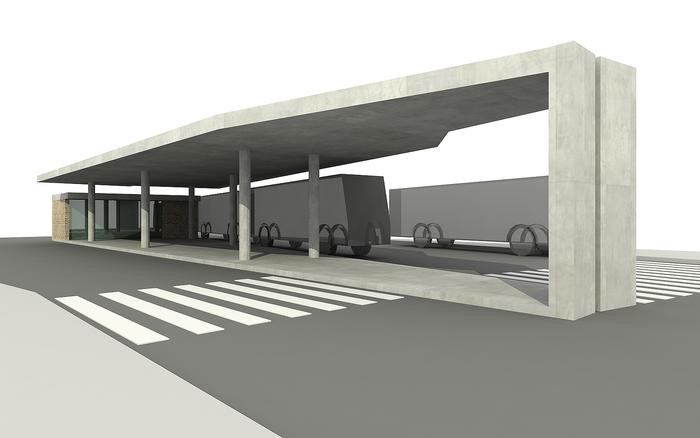 A l’exterior, es construirà una nova tanca per delimitar la nova estació, que disposarà de 4 andanes per a les parades dels autobusos, així com una zona destinada a l’estacionament. Per tal de protegir els viatgers de la pluja o el sol, a l’exterior es disposarà una marquesina adossada a la terminal, de forma triangular.