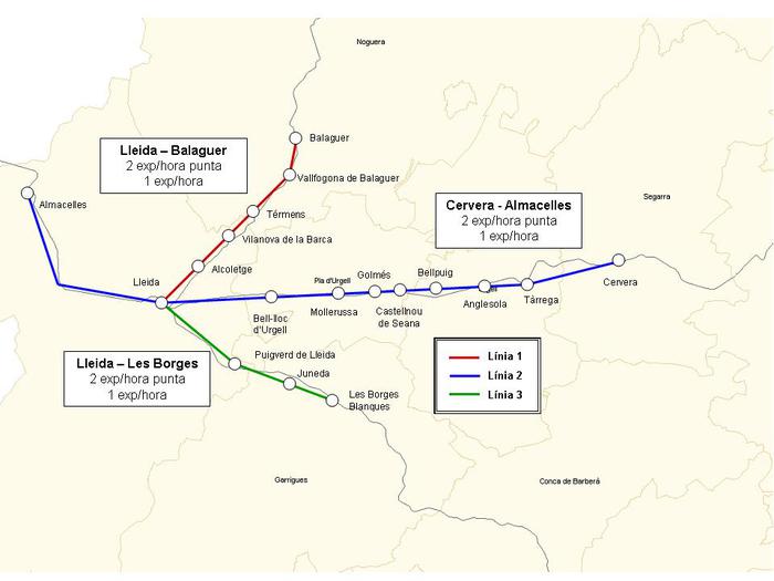 - Lleida. Es crearan tres línies diferents: Cervera-Lleida-Almacelles, Lleida-Balaguer, i Lleida – Les Borges Blanques, amb 2 expedicions en hora punta per sentit a tots els trams.