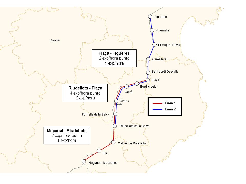 - Girona. Es crearan dues noves línies en paral·lel: Figueres-Flaçà-Girona-Riudellots de la Selva, i Flaçà-Girona-Riudellots de la Selva-Maçanet, amb 4 expedicions en hora punta i sentit entre Girona i Riudellots, i Girona i Figueres, així com 2 sortides a la resta de trams.
